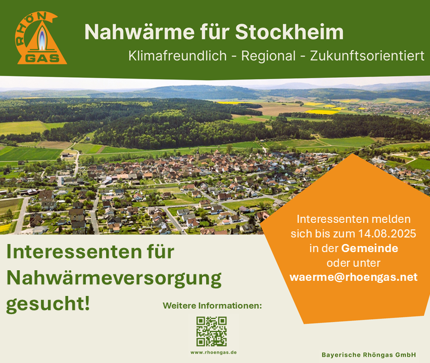 Klimafreundlich - Regional - ZukunftsorientiertIn Stockheim ist die Nahwärmeversorgung eine Aufgabe für die Gemeinschaft. Es braucht das Interesse der Bürginneren und Bürger, um ein solches Projekt wahr werden zu lassen. Die Ergebnisse der Interessenabfrage werden Anfang November diskutiert und über den Fortlauf des Projektes entschieden.